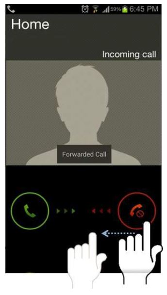 Tippen Sie das Symbol des roten Telefonhörers an, halten Sie dabei den Finger leicht gedrückt und ziehen das Symbol zur Mitte des Bildschirmes. Der Anruf wird damit abgewiesen.
